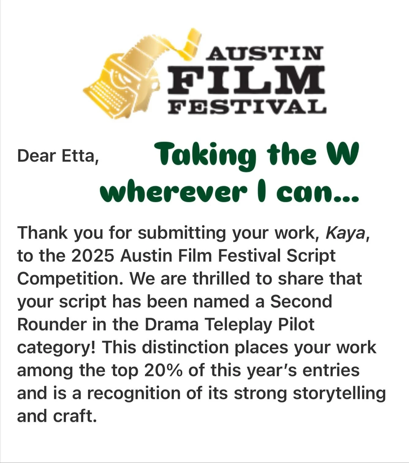 View fullsize One of my pilots, KAYA, made it to the Second Round of Austin Film Festival (not moving forward to the semifinals, boo). That makes 2 AFF Second Rounder placements for me. One of these days, I want to break the semis. But real talk — the indust